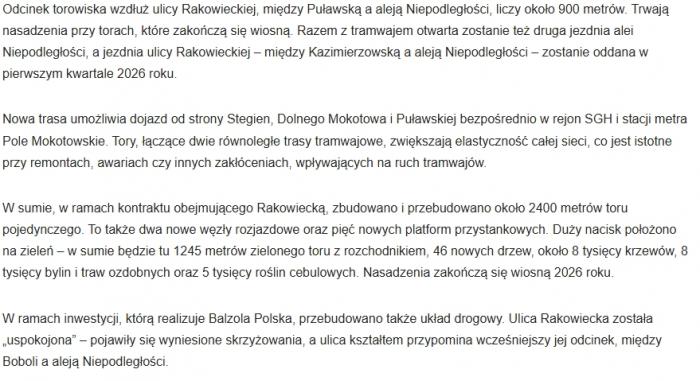 Trwają testy nowego torowiska na ulicy Rakowieckiej na Mokotowie. Wziął w nich udział m.in. prezydent Warszawy Rafał Trzaskowski. Już w poniedziałek, 22 grudnia, trasa zostanie otwarta i pojadą nią pierwsi pasażerowie. Tramwaje wrócą na Rakowiecką po blisko sześciu dekadach przerwy. Kursować nią będzie linia numer 19 – ze Stegien na Piaski. Z tej okazji, w dniu otwarcia nowej trasy, na tory wyjadą także zabytkowe tramwaje.