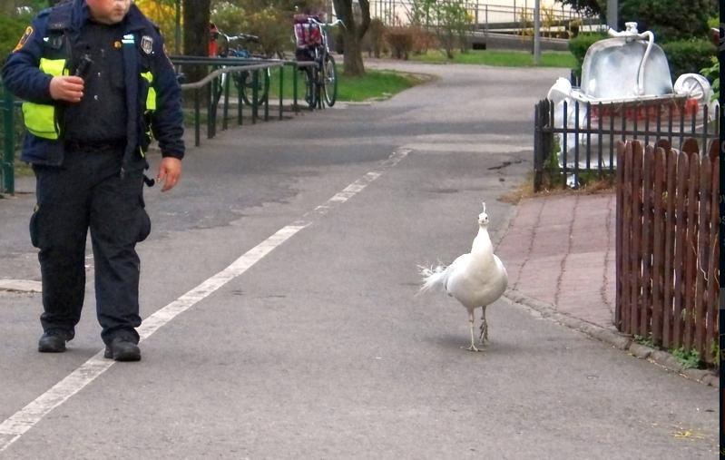 Najpierw mundurowi sądzili, że to łabędź, ale okazało się, iż był to niezwykle piękny paw. Był cały biały, na nodze miał obrączkę. Łatwo było się więc domyślić, że to taki VIP-uciekinier z Łazienek. A ponieważ na ulicach panował spory ruch, funkcjonariusze od razu zabrali się za eskortę podróżnika z powrotem do miejsca, gdzie znów byłby bezpieczny i szczęśliwy.