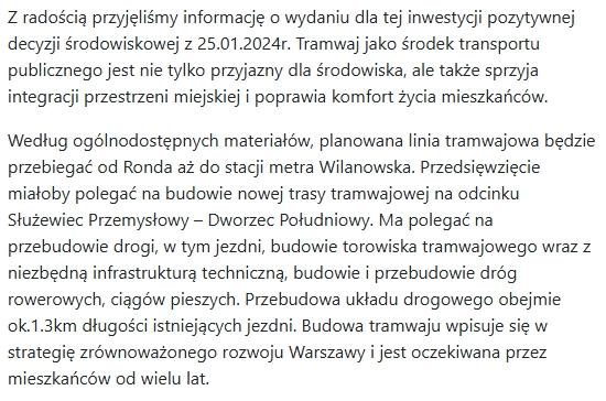W ostatnich latach można zaobserwować zdecydowany rozwój południowych dzielnic Warszawy, szczególnie w okolicy Służewca, Mokotowa i Wilanowa. "Rozbudowa osiedli mieszkaniowych oraz infrastruktury biurowej generuje coraz większe zapotrzebowanie na wydajny, ekologiczny i szybki transport publiczny. Obecny układ komunikacyjny w godzinach szczytu jest niewystarczający, a mieszkańcy zmagają się z korkami, wydłużonym czasem podróży oraz przepełnionymi autobusami. Budowa linii tramwajowej pozwoli znacząco poprawić dostępność komunikacyjną tych obszarów i odciążyć istniejące środki transportu" - zaznaczyli autorzy petycji, którą podpisać możecie, wchodząc z wyżej wspomniany link.