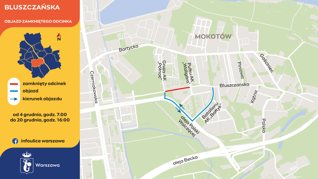 W czwartek, 4 grudnia, o godzinie 7:00 Bluszczańska zostanie zamknięta pomiędzy Pułku AK „Waligóra” a Grupy AK „Północ” – bez skrzyżowań z tymi ulicami na Mokotowie.